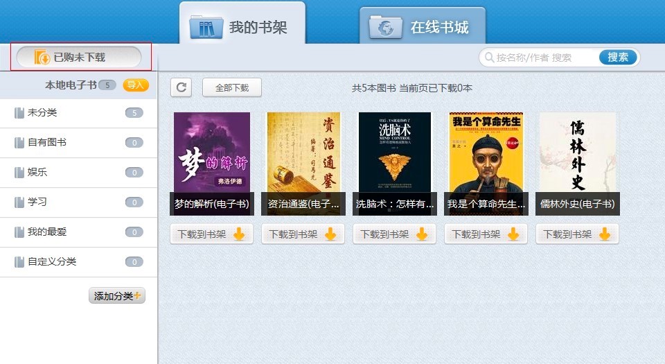 我们进入当当读书客户端之后,点击右侧的“已购未下载”的按钮,就能够查看当前账户已经购买,但是还未下载的电子书,我们点击书本下方的“下载到书架”的选项之后,就能够将这些电子书下载到本地书架中。