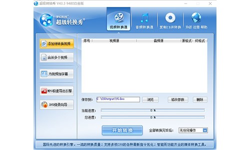 超级转换秀是国内首个优秀的影音转换工具,这是梦幻科技品牌旗下研发设计推出的优秀力作,集成音频转换、视频转换、CD抓轨、音视频切割/驳接转换、音视频混合转换、叠加视频水印、叠加滚动字幕,叠加个性文字/图片/视频相框等等于一身,超级转换秀内置国际一流的解压技术,支持各种CPU的SSE1/2/3/4,MMX,3D Now以及最新多核技术,转换质量一流,指令系统的全面优化,超级转换秀让您拥有更快速的转换速度,是你不容错过的选择,可以满足您所有的转换要求并成为您的转换工具首选。