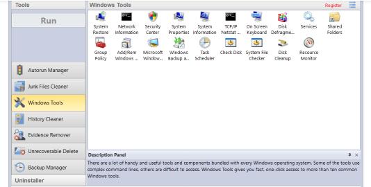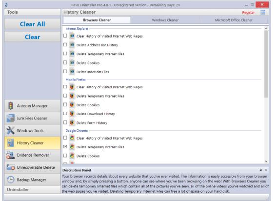 历史清理工具由三个模块组成——浏览器清理、 Windows 清理和 Microsoft Office 清理。每个都可以从历史清理器主窗口顶部的选项卡访问。使用清除按钮时,一个特定的清洁活动,或清除所有三个清洁器的所有按钮组合。