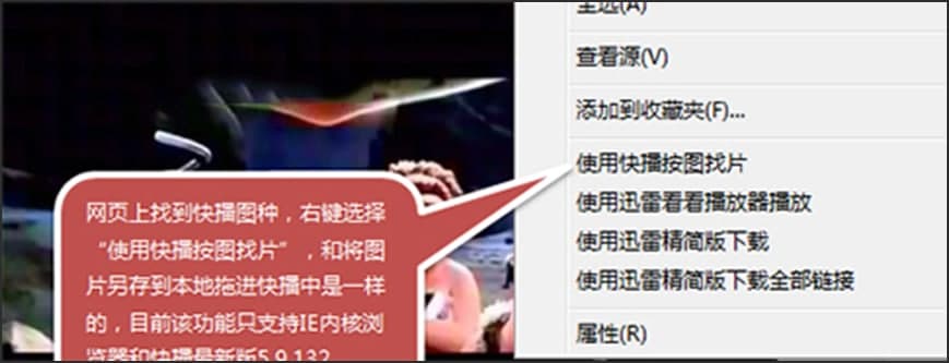 1.在浏览器中,找到快播制作的图像,可以右键单击该图像种子,然后选择[用快播按图片查找片段]直接调用它,而不是在本地保存图片然后将其拖动到快播中。