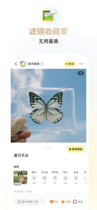 应用内涵盖海量模板,一键套用,免去设计排版的烦恼,还有各种风格多样的滤镜总有适合你,高效的编辑方式,优雅的创作排版,等你来黄油相机app体验!